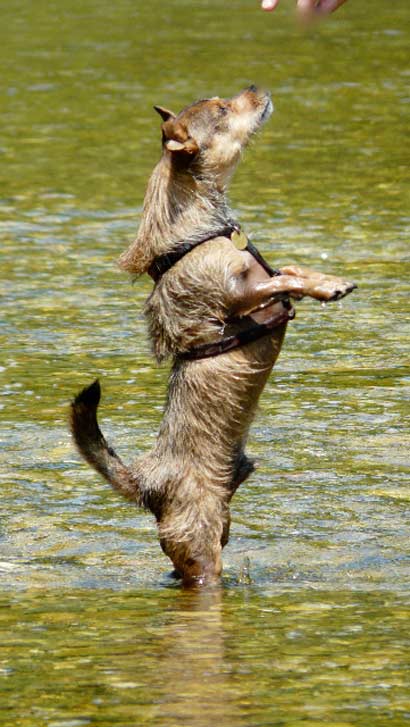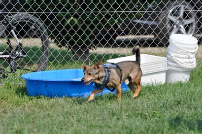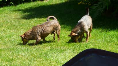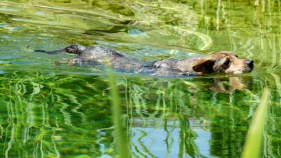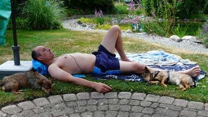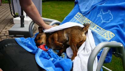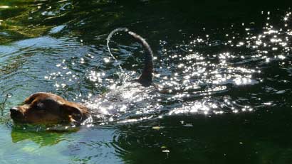 In jeder freien Minute von Frauchen und Herrchen geht es mit unseren super Veloanhängern ab zu Oma und Opa in den Schwimmteich baden. Natürlich hat jeder von uns einen eigenen Veloanhänger mit Chauffeur, wie es sich für zwei Chefs gehört!! Für Snoopy gibt es dann nur noch eins Baden, Baden und noch mal Baden. Ach ja, dazwischen wird sich ausgiebig im Gras gewälzt um dann gleich wieder los zu sprinten ins Wasser. Ich hingegen bin nicht so eine Wasserratte. Ich liege dann lieber gemütlich im Liegestuhl und gehe höchstens ab und zu mal meine Pfötchen abkühlen. Herrchen meint dann immer, ich bräuchte auch mal eine Abkühlung und setzt mich dann einfach ins Wasser so das ich wohl oder übel Schwimmen muss. Ich mag das aber nicht so gerne.