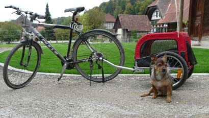 Ich wollte mich mal wieder melden. Seit meinem letzten Brief ist eine Menge Zeit vergangen, und viel Neues und Aufregendes ist passiert. Fangen wir mal vorne an. Ich war ja am Sommerfest mit meinen Leuten. Das hat eine Menge Spaß gemacht. Ich durfte sogar mein können im Mobility Parcours unter Beweis stellen. Ich denke das habe ich sehr gut gemeistert. Bin halt ein Naturtalent! Meinen Leuten hat es auch eine Menge Spaß gemacht. Sie fanden es eine super Sache, und haben ordentlich konsumiert um euch zu unterstützen. Und beim Flohmarkt haben sie auch noch reingeschaut. Und wie es so ist mein Frauchen muss immer etwas "poschten" (kaufen)!!! Da hat sie mir einen Velo anhänger geholt. Ich gehe ja soooooooo gerne mit, wenn Frauchen und Herrchen auf dem Fahrrad sind. Im Sommer wenn es dann ganz doll warm ist, da kann ich halt nicht so lange mithalten! Und deshalb finde ich diesen Anhänger supi, wenn ich nicht mehr kann, werde ich einfach verladen und weiter geht die Reise. Das macht Spaaaaassssss!!!! Das war wirklich eine super Investition.