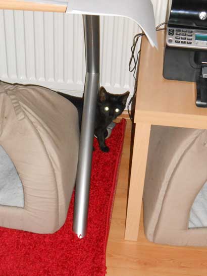 Kitty springt schön fröhlich umher, grad war sie schon aufm Schreibtisch und aufm Bett. Mimi ist noch etwas zurückhaltend, versteckst sich unterm Sofa, aber wenn ich länger im Zimmer bleibe, kommt sie auch raus.