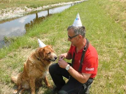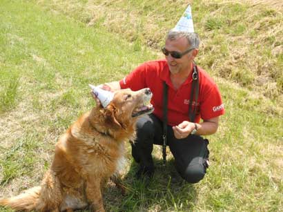 Ja, das Lied durfte ich vergangenes Wochenende hören – ich hatte nämlich Geburtstag und bin 10 Jahre alt geworden. Meine Leute haben sogar mit mir gefeiert – es gab jede Menge Hundekuchen, einen Bach zum Abkühlen und alle trugen einen lustigen Hut. Sogar ich ließ mich zur Feier des Tages dazu hinreißen … Ein wenig grau ist meine Schnauze geworden, auch gehe ich heute lieber gemächlich spazieren – aber ansonsten bin ich sehr fit und hopse auch noch allein ins Auto . Im Auto mitfahren gefällt mir immer noch, denn es ist immer so spannend, was mich Neues erwartet, wenn ich aussteigen darf. Meinen Job, nämlich auf Haus und Garten aufpassen, erledige ich auch immer noch sehr zuverlässig, meine Leute sagen immer, mit einem Einbrecher hätten sie Mitleid …