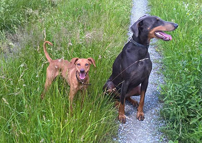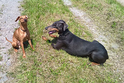 Lenny lebt nun mit einer bezaubernden Dobermannhündin zusammen, die beiden waren von der ersten Begegnung an beste Freunde. Beide Pinscher haben das selbe Temperament und spielen von morgens bis abends. Lenny hat nun auch einen großen Garten, in dem er für sein Leben gerne tobt und er darf viel wandern gehen.