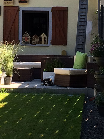 Locky liebt den Garten und Ball jagen und bringt ihn auch schon ganz toll zurück, meistens jedenfalls, bis er keine Lust mehr hat, dann spielt er alleine mit dem Ball weiter. Ich weiß nicht, ob es bei euch auch so warm ist, hier ist es fast unerträglich und wir alle sind froh, wenn wir uns nicht viel bewegen müssen. So auch Locky, er liegt faul im Schatten und versucht sich nicht so viel zu bewegen... ausser wenn es zum Spazieren in den Wald geht, wo es noch angenehm kühl ist und wo es so viel zu schnüffeln gibt....