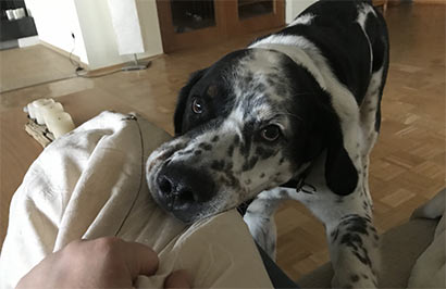 Da wir fast immer zusammen sind, ist er sehr auf mich fixiert. Aber, er geht gern in die „Bunte Hundescheune“, wenn ich durch regelmäßige Infusionen einen Tag ausgeschaltet bin. Unser Sohn wohnt inzwischen in Hamburg und dort herrscht strenge Leinenpflicht. Da hat er es in der Hundpension besser und spielt gern mit seinen Hundefreund, einer Dogge und anderen großen Hunden.