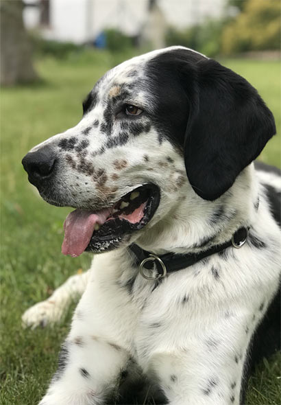 Zum Glück zeigt Lucky keine große Jagd-Leidenschaft. Er stöbert zwar gern und scheucht Vögel auf, aber nur Rehe, die direkt vor ihm aufspringen, jagt er kurz hinterher. Aber seine lange Nase ist sehr gut. Er findet oft die „Fährten-Wildteile“, die die Jäger in die Büsche werfen. Er bringt mir seine Fundteile nur ungern, weil sie doch sooo gut riechen. Auch unser Einkauf wird regelmäßig auf den Inhalt geprüft und in jeder Einkaufstasche verschwindet sein ganzer Kopf.