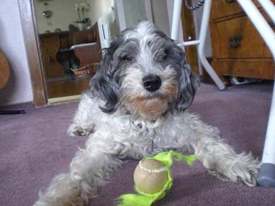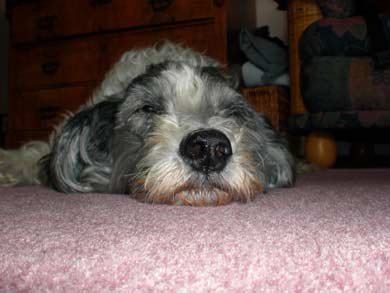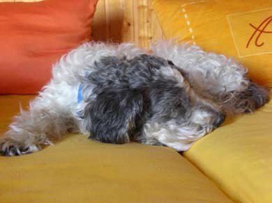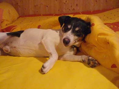 Als wir Boomer holten, war er gar nicht gut drauf. Durch den Stress (ausgesetzt und TH-stress) hatte er schlimmen Durchfall und erbrach sich ständig. Er hat 2 Tage später eine Infusion und Medis bekommen. Die Zähne wurden 1 Woche später saniert, dann gings langsam bergauf. Hühnchen mit Reis, was anderes hat er nicht genommen. Am ersten Abend bei uns ist er ganz vorsichtig auf meinen Schoß geklettert hat sich zusammengerollt und hat fest geschlafen. Seine Trauer über das verlorene Heim hat man ihm noch lange angemerkt. Als unser alter Hund im Dez dann starb, hat Boomer sich total verändert, er war nun die Nummer 1. Im Februar 11 kam dann Jacky Loupie zu uns. Der marschierte gleich ins Haus, in die Küche und in den Hundekorb, der am Heizkörper steht. An den hat er sich angelehnt, und im Sitzen geschlafen.