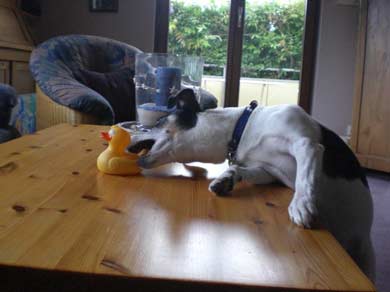 Als er sich schön aufgewärmt hatte, sprang er meinem Mann, der auf dem Sofa lag, auf den Bauch und hat alles aus erhöhter Sicht beobachtet. Der kleine Kerl frisst wie ein Staubsauger, ruck zuck ist die Schüssel leer. Er spielt begeistert mit dem Ball und liebt alles was quietscht. Die Quitsche wird dann gleich demontiert (siehe Entenbild). Boomer ist extrem eifersüchtig auf Loupie, was auch seine guten Seiten hat. Er frisst mehr, läuft mehr und hat das Spielen angefangen. Wir haben schon viel über die 2 gelacht. Loupie ist zu allem und jedem freundlich. Mit ihm ist es total relaxt gassi zu gehen, ohne Leine. Und das ganz ohne eigene Erziehungsarbeit.