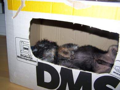 zur Schlafhöhle umgebauten Umzugskarton. Natürlich