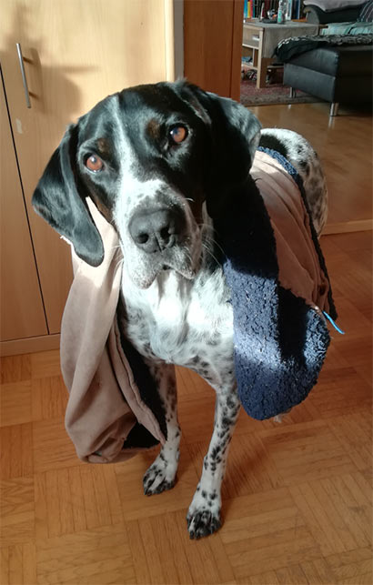 Meinen Stoffknochen schleppe ich jetzt bei jeder Gelegnheit an. Und dann gehts rund, ich sag´s euch! Die haben hier noch zwei Katzen. Mit denen verstehe ich mich ganz gut. Naja, zumindest mit der einen, der älteren. Die ist schon 15 und ziemlich entspannt. Die andere ist schwieriger. Mal ist sie nett, das nächste mal sieht sie mich nur und faucht schon. Launisch halt. Außerdem haben meine Menschen mir ganz viel beigebracht. "Kleines Hundeeinmaleins" nennen die das. Klein? Ich sag euch, das war ganz schön viel! Aber immer, wenn was klappt und ich gut mitmache gibt´s ein Leckerli als Belohnung. Und da ich Leckerli super finde bin ich natürlich mit Feuereifer beim Lernen dabei. Ganz oft bekomme ich auch Arbeit für die Nase.