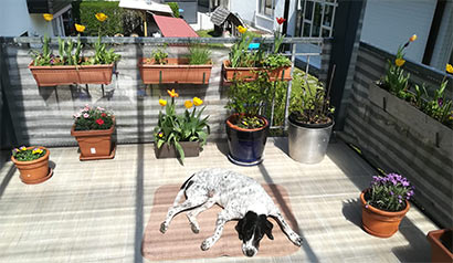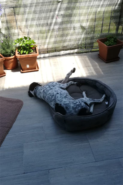 Außerdem liegt er gerne auf der Terrasse oder im Wohnzimmer in der Herbstsonne. Das sind seine Wohlfühlmomente.Im Moment sind wir grade dabei, ihm beizubringen, dass er für einen Schoßhund etwas zu groß ist. Im Überschwang der Gefühle sucht er so momentan die größtmögliche Nähe. :-)
