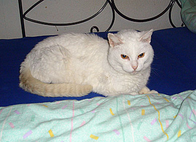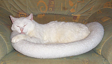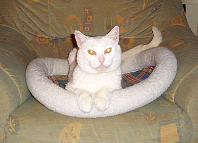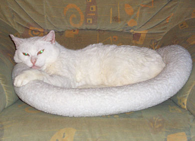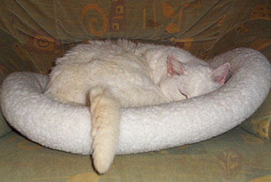 schmusen (sein Lieblingsplatz Nr. 1: das Bett; Lieblingsplatz