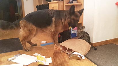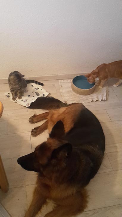 Seit nunmehr 5 Wochen sind unsere beiden Kätzchen bei uns eingezogen. Paule , ehemals Mikesch (SPA Colmar) und Mäxle, ehemals Max (SPA Ebersheim) machen uns ganz viel Freude. Man kann den beiden einfach nur zuschauen , wenn sie miteinander spielen und toben. Es ist so schön. Sie sind interessiert , am liebsten überall dabei, im Bad, in der Küche, im Schlafzimmer, alles gilt es zu erkunden. Oder auch im Wintergarten, da essen wir mittlerweile nur noch zu 5., unsere Schäferhündin Kleo nicht zu vergessen. Hund und Katzen haben sich prima aneinander gewöhnt. Paule ist Kleo gegenüber noch immer eine Spur cooler, mal sehen, ob Mäxle das noch aufholt. Beim Fressen ist Mäxle ganz klar der King, er hat mittlerweile auch schon 1kg zugelegt. Auf der Fensterbank des Kinder / Katzenzimmers beobachten die beiden die Welt, noch, bald aber geht’s hinaus in die große weite Welt. Wir haben jeden Tag eine große Freude und können es uns gar nicht mehr vorstellen ohne die Zwei.