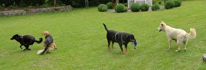 Gelegentlich ist sogar die ganze Bande zusammen in Nachbars Garten bei Nelly: Zorro, Nelly, Malka und Chiara (von links). Nelly ist übrigens aus Griechenland, Zorro Yadidi ist wie gesagt aus Rumänien und ich aus Frankreich, wie man weiß. Wo Chiara her ist, weiß ich nicht, aber es gibt in der Nachbarschaft auch noch andere Hunde, die von weit her kommen, aus der Türkei und Spanien. Und was treibt man als ältere Dame sonst den ganzen Tag?