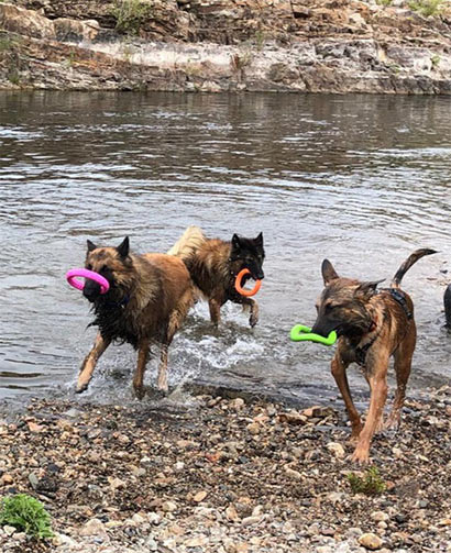 Er lebt glücklich mit seinen zwei Hundefreunden zusammen, die das Wasser genauso lieben wie er..