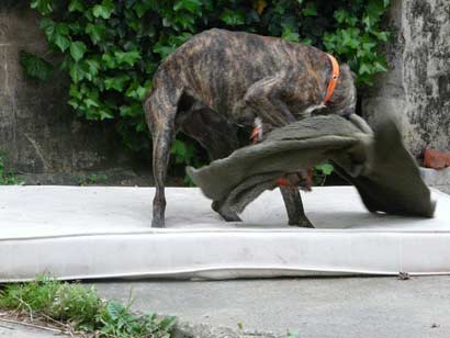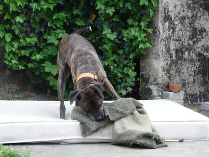 Zweimal ist Murphy allein auf Wanderschaft gegangen. Frau K. informierte die Polizei und suchte die Umgebung selber mit ab. Murphy wurde in der Nähe des Bahnhofs aufgefunden. Auf seinem Weg erweckten gelbe Müllsäcke sein Interesse. Frau K. brachte den Hund zurück und sammelte später den Abfall wieder ein. Um ein weiteres Ausbüchsen zu verhindern wurde vor die Gitterstäbe des Tores nachträglich ein weiterer Zaun angebracht. Der offene Eingang ins Gebäude kann immer genutzt werden. Zwei geräumige Hundekörbe stehen im Flur parat. Bei den warmen Temperaturen der letzten Nächte schlief Murphy aber auch gerne draußen.