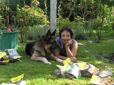 Wir suchten an verschiedenen Orten nach Hunderollwagen. Schliesslich fand ein ganz lieber Mann aus der Nähe von Düsseldorf eine super Adresse in Bochum. Im März sind wir dann nach Bochum gefahren, da habe ich einen Hunderollwagen auf Mass anfertigen lassen. Nok hat sofort begriffen, wie das geht und marschiert sehr gut darin. Die weite Reise hat er problemlos überstanden. Als sein liebster Tierarzt sah, wie gut Nok sich im Hunderollwagen bewegt, war er ganz erfreut und meinte: "Wenn der so weiter macht, dann geht der wieder selbst im Sommer..."