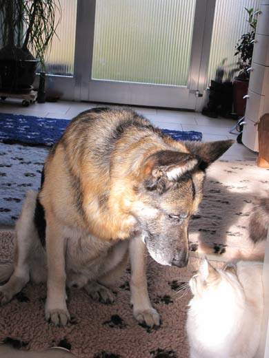 Letzten Sonntag bekam Nok Fieber. Ich bin sofort mit ihm ins Tierspital, da im letzten Herbst ein kleiner Tumor im Bauchraum festgestellt worden war. Deshalb habe ich darum gebeten, dass wieder ein Röntgen gemacht wird, da man auf der rechten Lendenseite eine Art Geschwulst tasten konnte. Es gab eine böse Überraschung. Nok hat einen sehr grossen Tumor im Bauch. Im Moment bekommt er Schmerzmittel. Fieber hat er auch ohne Medikamente keines mehr. Nok trinkt und frisst und kann sich noch fest versäubern. Die Blase zu entleeren bereitet ihm Schwierigkeiten. Daher muss ich ihn jetzt zeitweise katheterisieren. Die täglichen Spaziergänge geniesst er ziemlich zügig marschierend und seine Nase erhascht alle möglichen Düfte. Am liebsten läuft er nachts wenn Dachs und Fuchs unterwegs sind und er sie riechen kann. Fressen tut er nur noch, was ihm richtig schmeckt, Gemüse (am liebsten Tomaten), feines Pouletfleisch aufgeweichtes Hunde-Lachs-Trockenfutter... Jedoch ist uns allen klar, dass er nun bei der Regenbogenbrücke steht und bald dahin gehen wird, wo wir alle auch einmal folgen werden. Morgen werde ich mich mit dem "Haupttierarzt" von Nok besprechen welchen Weg wir am besten gehen werden.