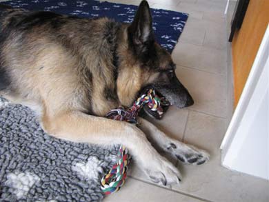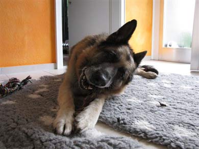 Im November hat Nok zum Geburtstag einen neuen Einsatzkeil im Auto bekommen, so dass er aus dem Fenster schauen konnte und nicht mehr so niedrig auf den Rücksitzen zu liegen kam. Er geniesst die Autofahrten und hat jetzt noch spezielle Sonnenstoren bekommen, wo er durchschauen, die Sonne ihm aber nichts anhaben kann. Diese Dinger findet Nok super, denn jetzt blendet es nicht mehr und er kann die ganze Fahrt hinaus schauen! Im Haus habe ich mehrere zusätzliche Gummimatten unter die Matten auf den Boden gelegt, damit er überall gut liegen konnte.