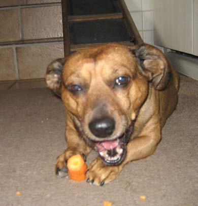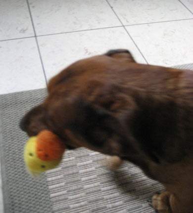 Hier waren dann alle schon in Aufregung, ob mir der Stress vielleicht schadet. Ich soll ja keinen Stress haben wegen meiner Leber! Aber die Hundetrainerin hatte einen guten Tipp für meine Familie. Und als Canela dann eingezogen ist .....- na ja, die ersten Stunden hab ich sie schon noch angebellt, sobald sie sich bewegt hat....... ins Eßzimmer hab ich sie auch nicht reingelassen. Da liegen ja schließlich meine Spieltiere..... und die teile ich mit niemand - auch nicht mit Gina - und erst recht noch nicht mit Canela....... Na ja, jedenfalls nachdem ich mal deutlich gesagt hab, dass ich der Chef hier bleiben will, hab ich mich mit Canela angefreundet.