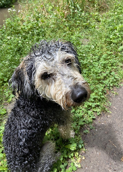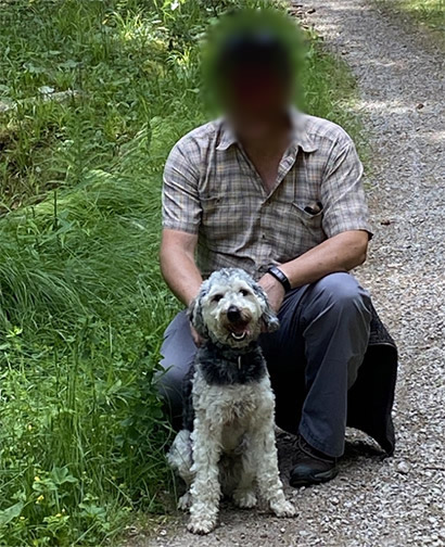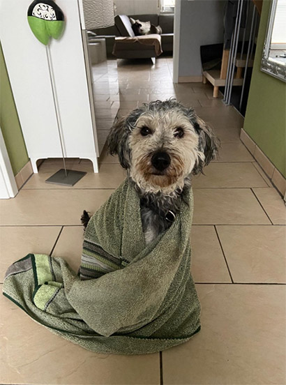 Heute fahren wir für das Wochenende wieder weg und natürlich darf er auch wieder mit. Er ist ein begeisterter Wanderer, Bachüberquerungen liegen ihm nicht so, obwohl er inzwischen ins Wasser geht. Ab und an erschrickt er noch, aber dann kommt er zu mir und auf meinem Arm beruhigt er sich dann auch wieder.