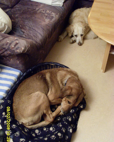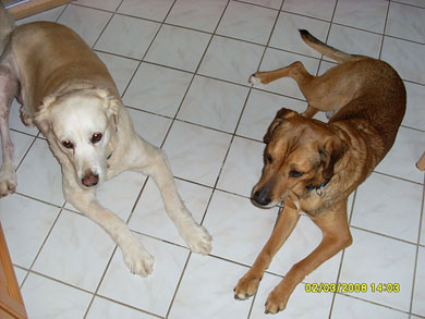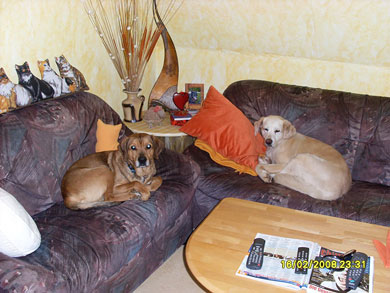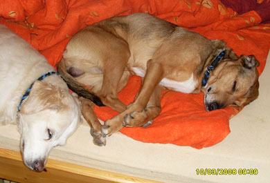 Er musste ich im Dezember 2010 noch an eine neue Mitbewohnerin gewöhnen. Seine Mitbewohnerin Lexi musste leider im Juli 2010 wg. Nierenversagen eingeschläfert werden und im Dezember kam dann das Labrador-Mädchen Terry zu uns. Nach den anfänglichen Schwierigkeiten haben sie sich nun wunderbar zusammen gerauft. Terry ist ziemlich dominant und das hat Olli zu beginn zu spüren bekommen. Zumal Olli ja ein ganz zierlicher Hund ist und Terry ihn meistens umrennt, wenn er im Weg steht. Zu anderen Hunden und Menschen ist er immer sehr freundlich. Nur ohne Leine können wir ihn nicht laufen lassen, da er als unkastrierter Rüde dann leider keine Ohren mehr hat und dann erstmal auf Tour geht. Aber er fühlt sich an der Leine auch wohler und sicherer.