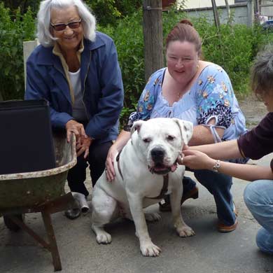 Ich habe euch doch im Mai erzählt, dass ich, dank euch, eine neue Familie gefunden habe. Jetzt muss ich euch noch mal etwas erzählen: Ich habe immer wieder an meine Kollegen in Colmar denken müssen. Deswegen habe ich Herrchen und Frauchen gefragt, ob sie einverstanden sind die Hundekissen und Decken von Wotan (meinem leider verstorbenen Vorgänger), die mir einfach zu klein sind, meinen Kumpels in Colmar zu vermachen. Die Beiden waren sofort einverstanden. Dann konnte ich sogar noch 24 große Dosen Nassfutter abschwatzen ;-) Das Alles haben wir dann am Samstag (11.6.) nach Colmar gebracht. Also ich muss euch sagen, ich habe mich zwar seeehr gefreut ein paar bekannte Gesichter wieder zu sehen und mir ein paar Streicheleinheiten abzuholen – aber ich hätte nicht gedacht, dass mich der Besuch derart stressen würde . Ich hatte fürchterliche Angst, dass ich womöglich wieder dort beleiben müsste und bin vorsichtshalber nach dem Foto-shooting sofort wieder ins Auto gehüpft!!