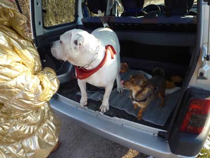 Ja – was ist sonst so alles passiert in diesem Jahr – ach ja – das wisst ihr alle ja noch gar nicht: Ich bin mittlerweile auch Mitarbeiter bei Sans Frontière! Mein Frauchen hilft seit letztem Sommer dem Team Ebersheim ein bisschen. Tja und als es jetzt im Winter so furchtbar kalt war haben mein Herrchen und mein Frauchen einen Pflegehund zu sich genommen, damit der kleine Kerl einen warmen Platz hatte, bis er in seine neue Familie konnte. Das hat supergut geklappt. Ich war ganz lieb und sozial zu Justin. Danach kam Flocky zu uns. Der hatte anfangs Angst vor Männern und vorm Autofahren. Dem habe ich dann beigebracht, dass nicht alle Männer böse sind. Mein Herrchen zum Beispiel ist nämlich super! Auch das Autofahren habe ich ihm schmackhaft gemacht! Flockys neuer Familie hat das natürlich gut gefallen, dass er jetzt sogar ganz gerne ins Auto gehüpft ist.