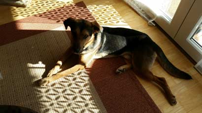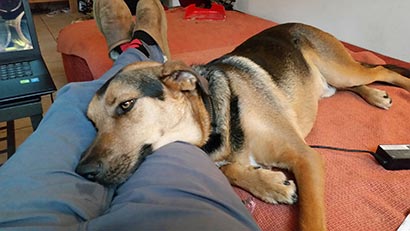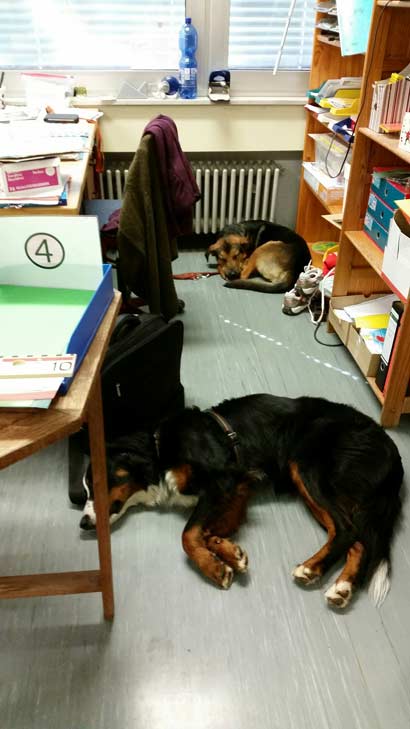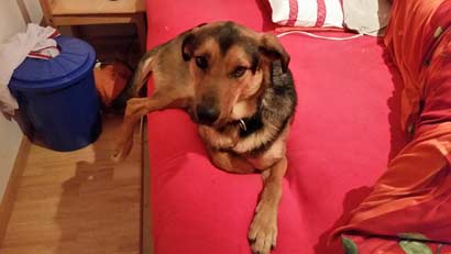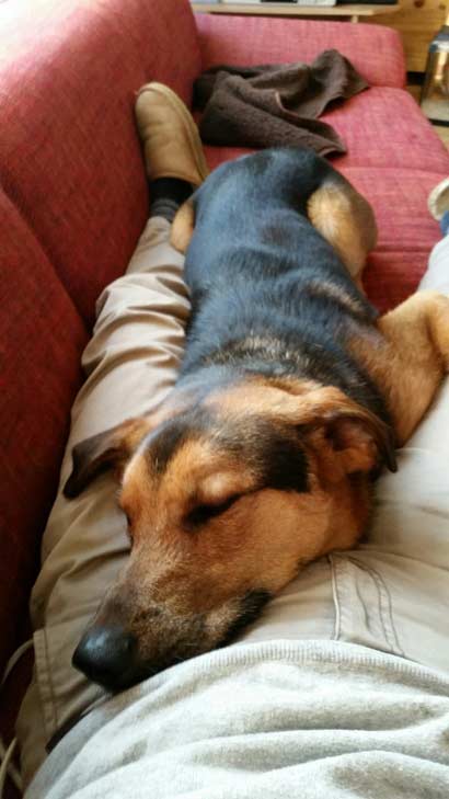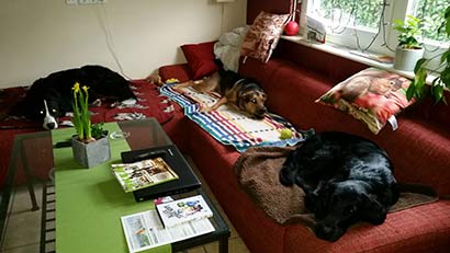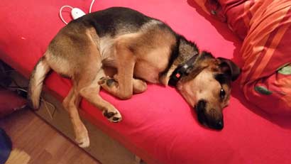 Liebe Frau Herr, Rocky chillt gerade nach dem Inliner fahren und sieht so kuschlig aus, dass ich an Sie dachte. Er ist viel zugängiger geworden, schnappt und kneift aber Fremde immer noch aus dem Nichts heraus. So kann ich ihn leider nicht mit in die Schule nehmen. Aber wenn er jemanden einmal kennt, kuschelt er sehr gerne und ausgiebig mit diesem Menschen. Seine absolute Lieblingsbeschäftigung ist fressen, nein: klauen ! und fressen. Er macht Türen auf und vor ihm ist nichts sicher. Selbst bei den Kaninchen klaut er die Karotten. Kaninchen findet er nur interessant, wenn sie rennen. In den letzten Wochen war er schwerstens verliebt. Lila, die schwarze Hündin meiner Kollegin wohnt über uns und war läufig. Die beiden sind nur noch umeinander schawenzelt - zum Totlachen. Mit Nuri versteht er sich nach wie vor gut. Für mich bleibt er immer wieder eine Herausforderung.