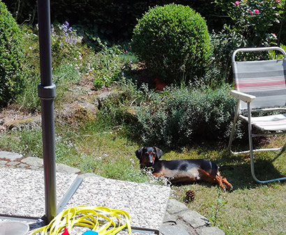 Hallo, Pocket hat sich schon ganz gut eingelebt und fängt bereits an, sein Revier zu verteidigen. Briefträger und Paketboten verfielen beim ersten Mal fast in Schockstarre, weil es bisher bei uns keine "Rückmeldungen" gab. Bis auf das unerwartete Bellen verliefen aber alle Begegnungen problemlos, da er ja dabei keine Aggressivität entwickelt. Einige Hundekontakte in unserem Viertel sind auch schon gelaufen und waren durchweg friedlich/problemlos. Mittlerweile hat er auch das gesamte Haus "in Besitz genommen". Die offene Holztreppe in das Dachgeschoss war für ihn überhaupt keine Herausforderung, er nutzt sie mit einer beeindruckenden Sicherheit. Die anfänglich tatsächlich auch bei uns vorhandene Scheu vor der Kellertreppe hat er schnell abgelegt. Gestern Abend hatten wir ein heftiges Gewitter mit Stromausfall, da ist er sogar bei völliger Dunkelheit mir hinterher in den Keller zum Zählerkasten gefolgt.