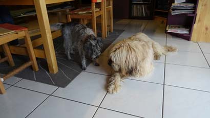 Für Paula war es schon etwas ungewohnt, dass ein so stürmischer Verehrer jetzt dauerhaft bei uns bleiben wird. Doch sie zeigte, wo die Grenzen sind und Poldi akzeptiert das. Klare Aufteilung: Auf das Sofa im Wohnzimmer und den Sessel unterm Dach darf Paula, während Poldi davor Wache schiebt. Das Hundekissen nimmt er nicht als Ruhestätte an, bei dem Fell reichen wohl der glatte Boden, der Teppich unter dem Wohnzimmertisch oder die Hundedecken an der Fensterfront.