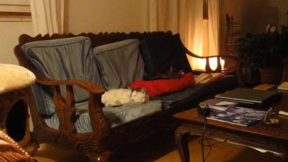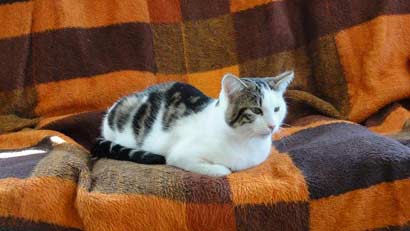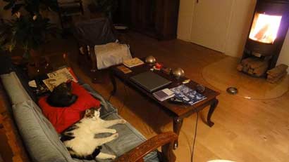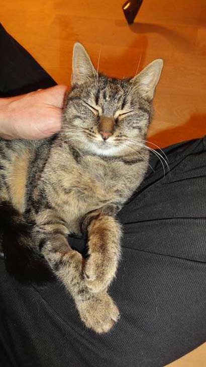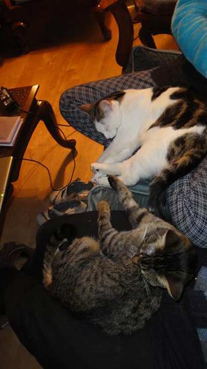 Sie haben sich auf Anhieb sich sehr gut zurechtgefunden, und sind ausgesprochen zutraulich (!!! Entzug?), eigentlich nach der kurzen Zeit unglaublich. Die kleine Linette lässt sich stundenlang kraulen und produziert ein lautstarkes Schnurrkonzert, Mag Hitze hat sich gleich vor den Schwedenofen installiert. Die Fäden waren anscheinend doch "selbstabsorbierend": es waren keine mehr da, und sie sind anscheinend nach dem 7.1. von Niemandem entfernt worden, umso besser.