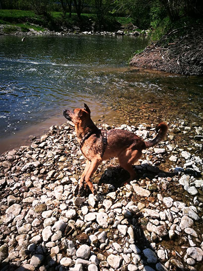 In jeglicher Alltagssituation, sogar mit unkastrierten Rüden in allen Größen, ist er freundlich, mutig, freudig und immer neugierig. Letzten Samstag haben wir Rantan das erste Mal mit dem Element Wasser bekannt gemacht! Erst war er ganz vorsichtig, wir nehmen an, dass es tatsächlich sein Erstkontakt mit Wasser war, dann bemerkte er, dass es ihm, so mitten im Fellwechsel mehr als nur ein bisschen gut tut. Er konnte gar nicht genug davon bekommen, sprang sogar mutig vom Ufer aus in den Neckar, sodass er ganz untertauchte. Er schien dankbar für die willkommene Abkühlung bei fühsommerlichen Temperaturen. Wir haben großes Glück mit ihm und er wohl auch mit uns
