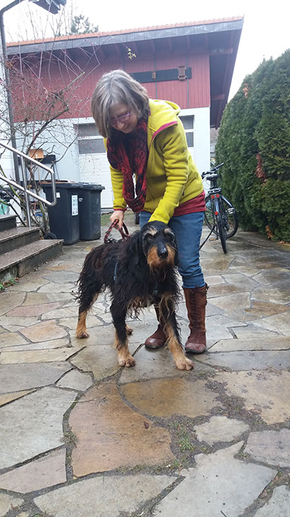 Also kam Reglisse am 23.12.2016 zu uns Wir waren alle gespannt was uns erwartet. Während der Autofahrt war ihm kurz mal übel, ansonsten blieb er gelassen. Reglisse souverän, wenn auch sehr aufgeregt, betrat unser Grundstück und ging ins Haus. So als ob es nie anders war. Zunächst bekam er alles gezeigt, dann eine neue Frisur verpasst. Der alte Filz kam weg. Als richtiger Rüde musste er erstmal markieren. Aber das haben wir schnell mit Feudel und Febreze in den Griff bekommen. .Cotorra unsere Hündin beobachtete alles neugierig. Die beiden verstanden sich gleich gut. Unsere Katzen sind noch misstrauisch.