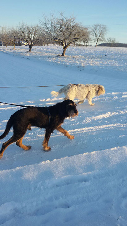 Reglisse ist heute 2 Wochen bei uns. Er unternimmt mit mir und Cotorra inzwischen schon längere Spaziergänge. Nur die Kälte mag er nicht. Wenn wir nach Hause kommen, geht die Tür nicht schnell genug auf und es wird hineingestürmt. Wenn wir draußen bei den Pferden sind(am Haus), vergnügen Cotorra und Reglisse sich im Garten. Er läuft auch schon zu den Pferden. Wieder im Haus wird doch gern ein Kauknochen genagt und anschließend ein Schläfchen gemacht. Der Appetit ist schon groß – bei beiden! Es ist so, als ob er schon immer bei uns war.