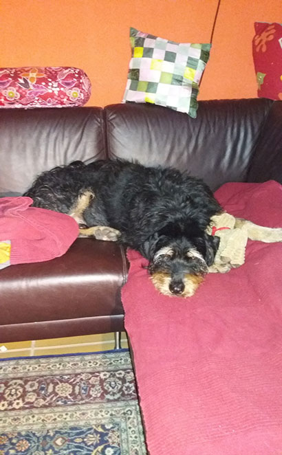 Es ist an der Zeit, etwas Neues von Reglisse zu berichten. Es geht ihm gut. Er liebt das Leben. Ganz wichtig sind ihm ritualisierte Abläufe .Nach den Spaziergängen hat er es immer eilig wieder ins Haus zu kommen. Dann wird eine Runde mit seinem Quitschi oder dem alten Kissen gespielt und dann wieder gemütlich irgendwohin gefaulenzt. Am liebsten in die Sofaecke.