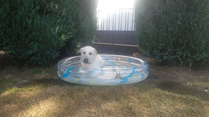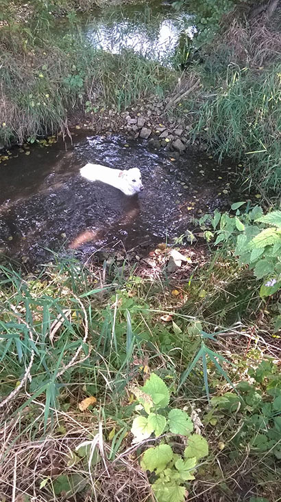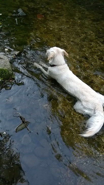 Was ich auch noch gerne mache: im Wasser planschen oder sogar schwimmen! Hinter unserem Haus verläuft ein kleiner Bach, da gehe ich mit Herrchen manchmal rein und kann dann dort nach Herzenslust herumspringen oder schwimmen. Überhaupt: Herrchen ist total klasse!!!!!!