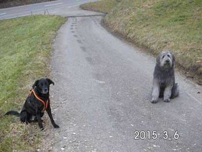 Schon bald 2 Jahre ist Reyko nun bei uns und wir haben die Entscheidung für ihn noch nie bereut. Das Bild zeigt Reyko mit der Bergamasker-Hündin Elena, mit der wir regelmässig laufen gehen.