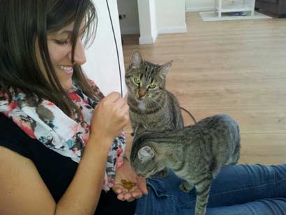 Die tollen Katzen-Damen haben sich sehr gut bei ihrer neuen Familie eingelebt und genießen ihre wiedergewonnene Freiheit. Die Tigerinnen Rosie und Shiva sind anhänglich und lieb und verstehen sich immer besser untereinander.