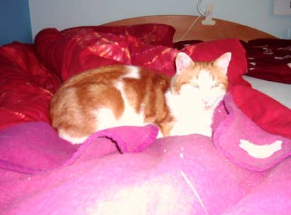 Die Scheu vor Fremden innerhalb der Wohnung hat er nicht mehr so, aber draußen ist er sehr misstrauisch und lässt sich von niemandem anfassen. Vor der Straße scheint er wirklich Respekt zu haben, er orientiert sich mehr zur anderen Seite wo die Gärten sind. Mit anderen Katern kann er sich schon auch mal anlegen, das kann ganz schön laut werden, da schenken sie sich nichts.