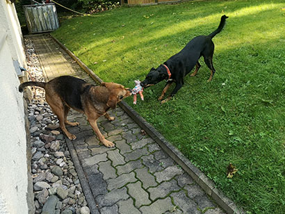 Sie geht weiterhin jedem ärger aus dem weg, und splittet, wenn nötig bei anderen Hunden, die zu sehr miteinander raufen.