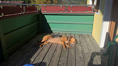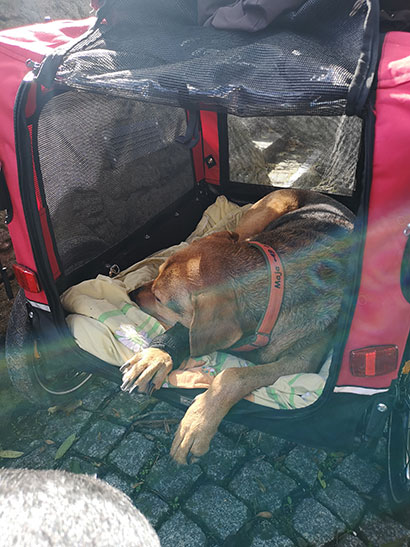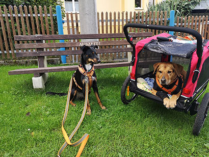 Wir waren wieder in langem Urlaub in der Sächsischen Schweiz. Kleines Haus und 2000m² Grundstück. Elsa hatte ihren Spaß dort, die musste ich immer suchen auf dem Gelände. Und wir waren beides Platt abends. Frauchen hat meinen Jogger dabei so konnten wir schöne Spaziergänge machen und wenn ich nicht mehr konnte, bin ich eingestiegen und wurde gefahren bis ich wieder fit wahr.
