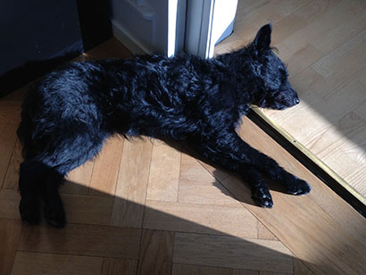 Es läuft alles super. Jeden Tag wird es ein bißchen besser mit dem Kurz-Alleine-Bleiben. Moody macht sich wirklich prächtig. Sie ist eine große Freude. Und eine Sonnenanbeterin :-)