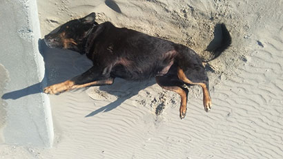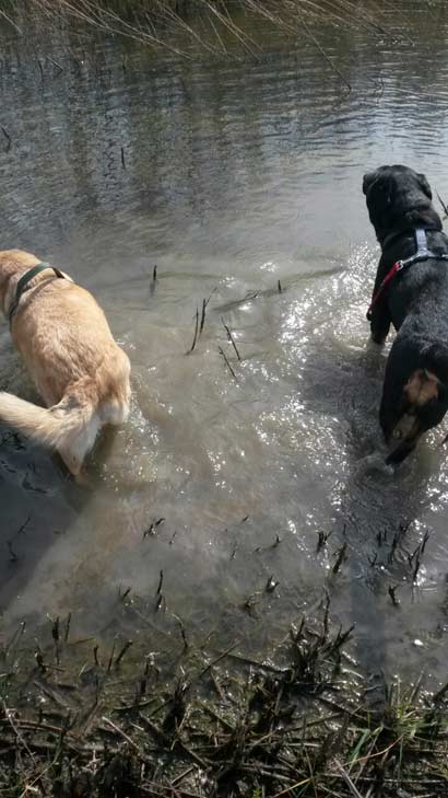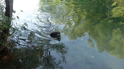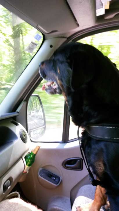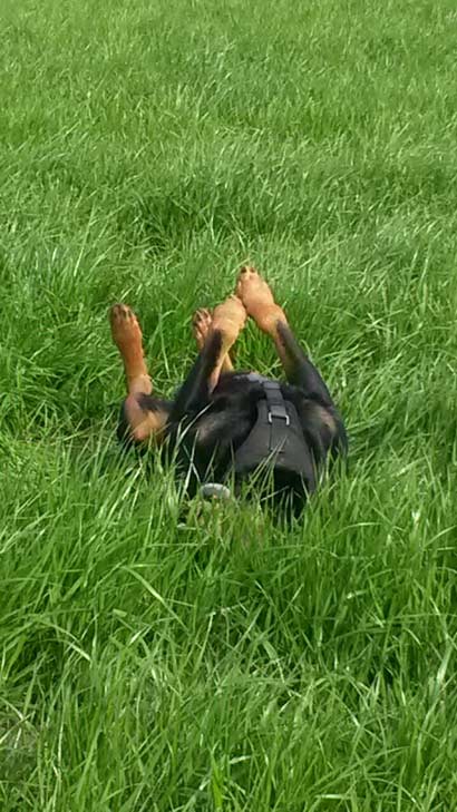 Während der Arbeitszeit kommt eine Frau, die mit ihm eine Stunde Gassi geht, mittlerweile reicht ihm ein kleinerer Spaziergang, man merkt doch, dass er in die Jahre gekommen ist.