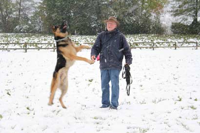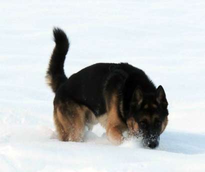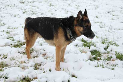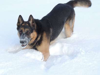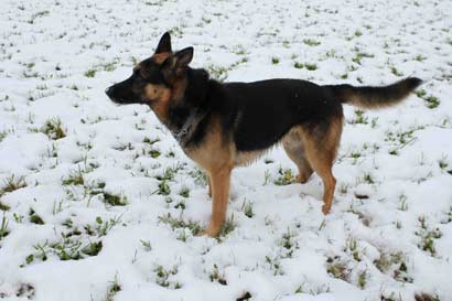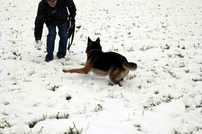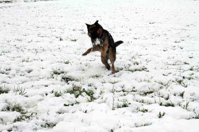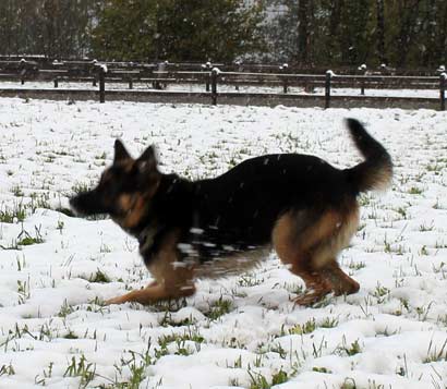 Am Sonntag hat es geschneit. Wir gehen mit Smokie runter zum See. Auf einer verschneiten Wiese lasse ich ihn zum ersten mal von der Leine. Er ist überglücklich und spielt mit einer Riesenfreude, fängt Schnebälle aus der Luft und rennt hüpfend und knurrend im Kreis herum.