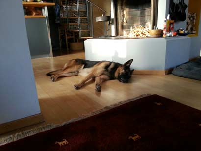 Hallo Michaela, Bonjour Martine Habt ihr das Bild schon gesehen? Da seht ihr Smokie in seinem Hauptjob als verwöhnter Pascha. Er hat übrigens in der Zwischenzeit gänzlich aufgehört zu knurren (ausser beim Tierarzt, da tut er wie ein Berserker). Wenn er jetzt vor irgendetwas Bedenken oder Angst hat geht er weg oder macht einfach Sitz. noch.