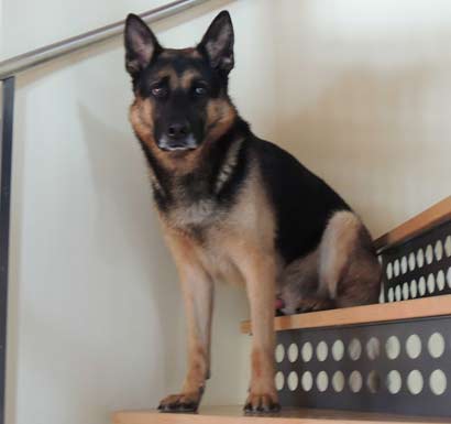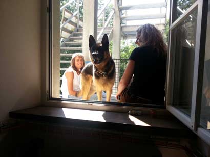 In der Zwischenzeit ist auch sein Wach- und Schutztrieb erwacht. Wenns klingelt rennt er laut bellend zur Tür. Das macht er sowohl zu Hause als auch im Geschäft.