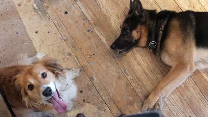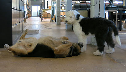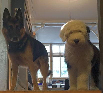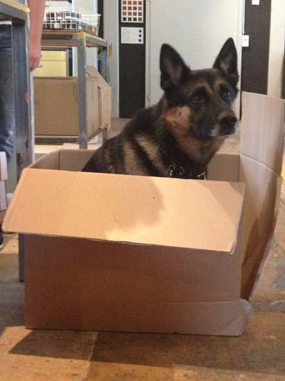 Wir hatten diese Woche zweimal Handwerker im Geschäft. Smokie ging immer wieder schauen was sie gerade machen und hat immer alles genau beobachtet. Ich bin sehr glücklich darüber, dass er so ein lieber, verträglicher Kerl ist.