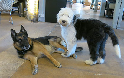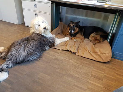 Von den Frauen in der Firma wird er richtig verwöhnt. Morgens warte er schon bis sie kommen. Mit jeder hat er ein eigens Begrüssungsritual, das aber immer mit einem Guetzli endet. Tagsüber geht er dann reihum um sich seine Streicheleinheiten abzuholen.