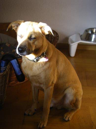 Leider hat er vom Halti schon zweimal eine dicke Nase gehabt,