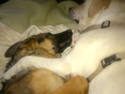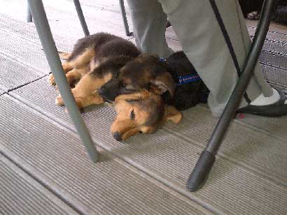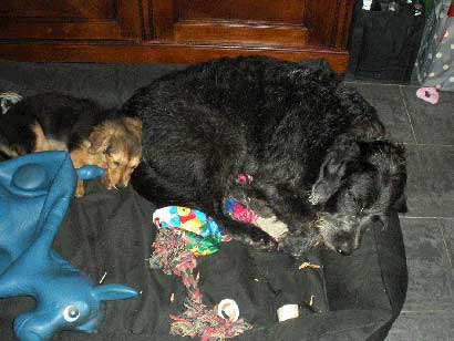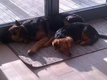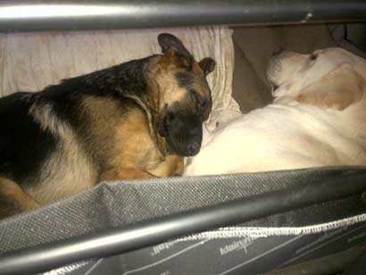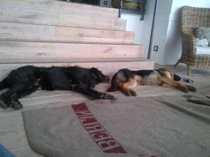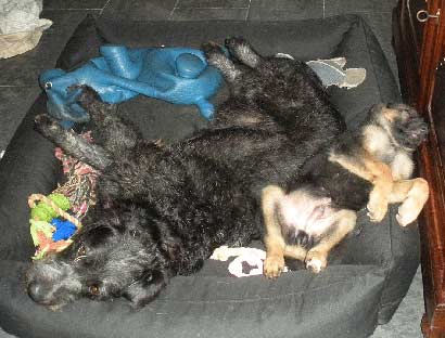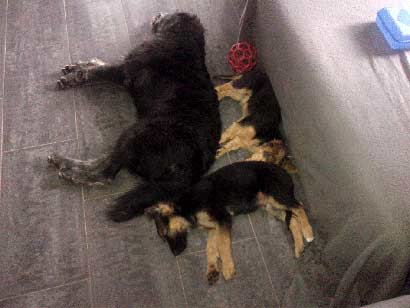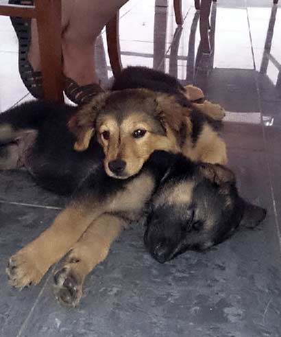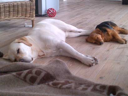 Wir haben es jetzt geschafft unserem blinden Jackson ein bisschen Masse auf die Rippen zu füttern. Er hat einen wahnsinns Wachstumsschub gehabt und ist jetzt entsprechend schon ein paar Zentimeter größer als unser Speed (ehemals Stan). Beide Kerlchen sind putzmunter und ganz schön wild unterwegs.Sie raufen viel miteinander - wie das richtige Kerle eben tun. Jackson (ehemals Boby) ist mittlerweile sogar so heiß drauf, dass er unseren 10 Monate alten Labradoodle (65cm, 32kg) lautstark bellend und hüpfend zum Spielen auffordert. Bei unserem Riesenbaby braucht es nicht viel, um ihn zu animieren..., sprich die beiden sind schon wie Pat & Patterchen. Man vergisst bei Jackson schnell, dass er blind ist. Er hat seine gewohnte Umgebung haargenau abgespeichert.