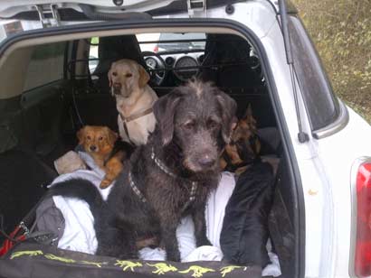 Damit alle im Platz im Auto haben, wurde rechtzeitig ein neuer Mini angeschafft und ihr Frauchen hat jetzt einen Online Shop www.meine-futterbox.de (auch bei facebook) mit Barf-Alternativen und Snacks und Kauartikel.